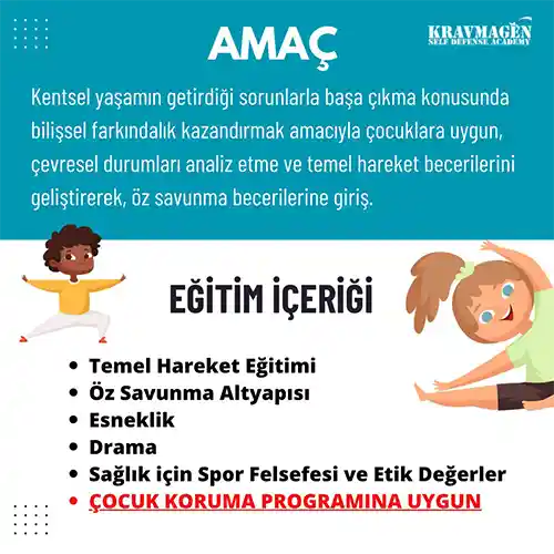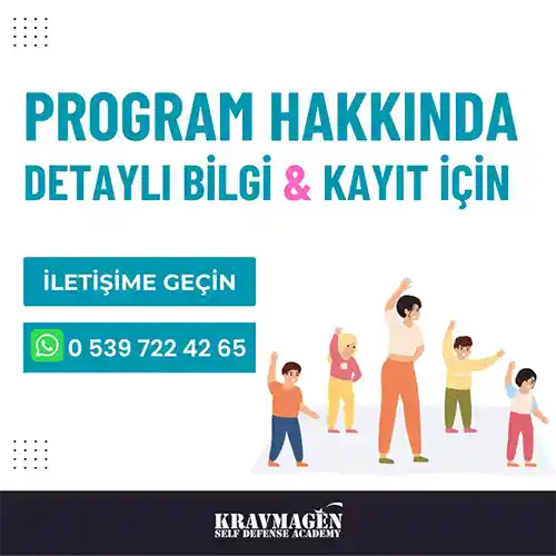 Çocuk Koruma Programı'na uygun olarak tasarlanan Krav Magen Spor Okulu, 5-12 yaş aralığı çocuklar için hazırlanmıştır.